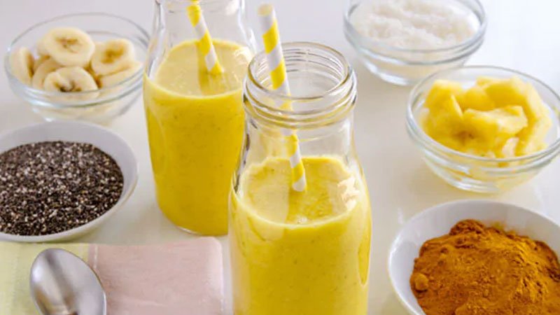 This recipe contains banana, pineapple, flaxseeds, coconut milk, coconut oil, ginger, cinnamon and turmeric. This drink can be a powerful addition to your diet if you are looking to improve the health of your skin. The coconut oil and milk are sources of healthy fats and important vitamins, and the shiny flaxseeds give you a dose of omega fatty acids. Ginger and turmeric are both root spices that are said to have anti-ageing benefits by improving skin elasticity and fighting inflammation.