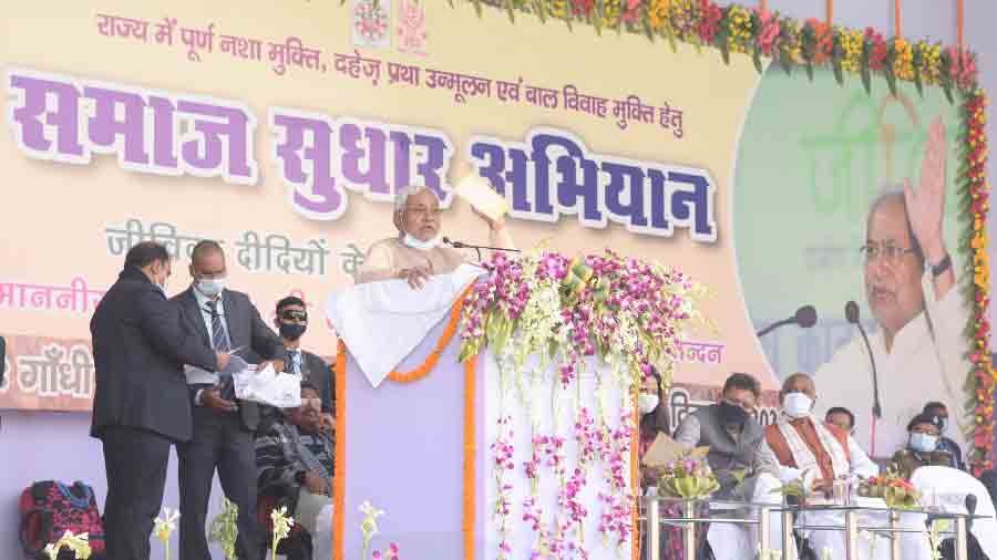 Addressing a public meeting attended by thousands of women associated with the state government’s Jeevika (Bihar Rural Livelihoods Projects) self-help groups working in the field of socio-economic uplift, Nitish reminded the people that he implemented prohibition on the demand of women.