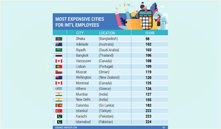 Also, Dhaka remains the most expensive city in South Asia, beating Mumbai (127th), New Delhi (155th), Chennai (177th) and Bengaluru (178th), Colombo (183rd), Karachi (223rd), and (224th) Islamabad, according to the list released on Wednesday.