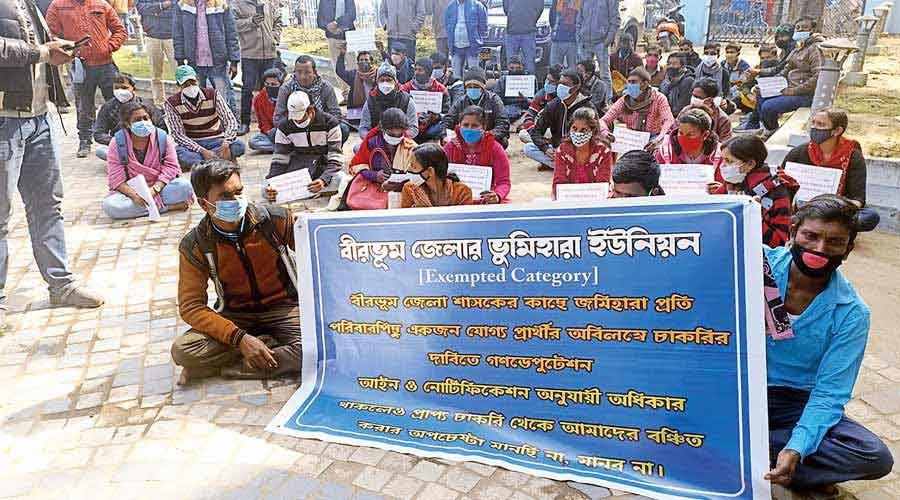 Snehamoy Chakraborty, Bolpur(Birbhum): Members of families, which had donated land to set up various government projects earlier but were yet to get promised government jobs, agitated in front of the Birbhum district magistrate’s office on Wednesday.