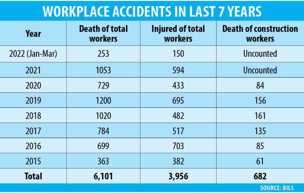 According to Bangladesh Institute of Labour Studies (BILS) survey, as many as 6,101 workers have died and 3,956 have been injured in workplace accidents between 2011 and 2020. The highest 1,200 workers died in 2019, and there were 1,053 workplace accident deaths in 2021.