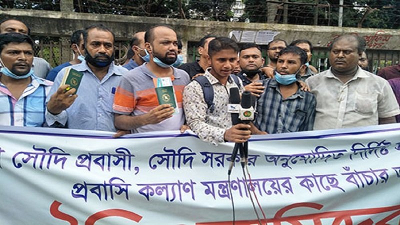 A group of Bangladeshi migrant workers demonstrated at Karwan Bazar on Tuesday morning demanding tickets to Saudi Arabia so that they can join their workplaces.