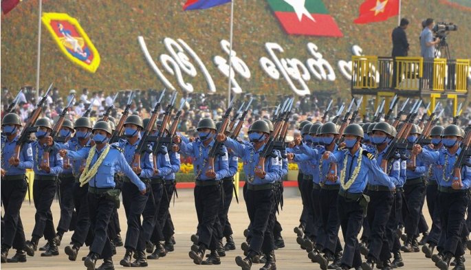 Junta soldiers march during the Myanmar Armed Forces Day parade in Naypyitaw in March 2021.