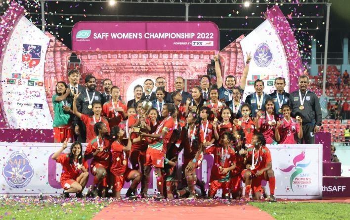 The team created a new history when they for the first time clinched the most prestigious regional title, SAFF Women’s Championship title, beating Nepal by 3-1 goals in the final match at their home at Dasharath Stadium in Kathmandu, Nepal on Monday.