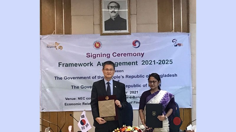 South Korean Ambassador to Bangladesh Lee Jang-keun and Secretary Fatima Yasmin of the Economic Relations Division signed the new framework arrangement between Korea and Bangladesh on loans from the Economic Development Cooperation Fund (EDCF) for the years 2021 through 2025.