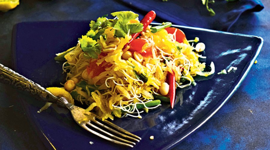 Raw papaya salad or Som Tam is a classic Thai salad and a delicious way to eat this green fruit. This version calls for seasonal raw mangoes, which are excellent source of Vitamin C and A and keep the body hydrated in this heat. Small steamed or poached prawns pair very well or you could omit them altogether for a veggie version.