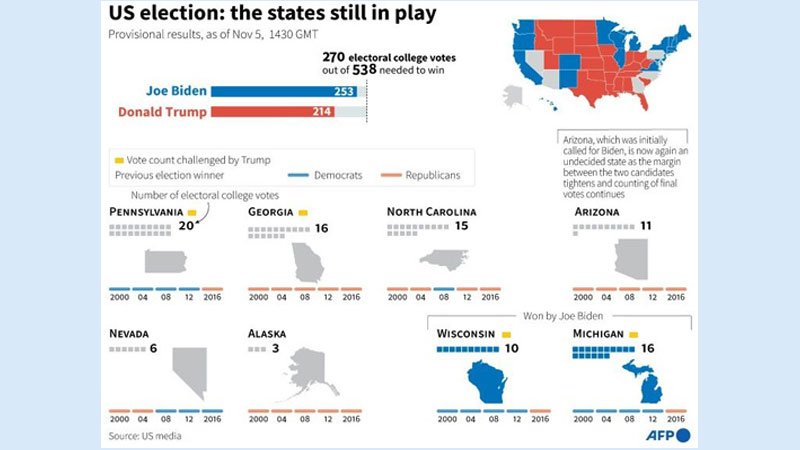 It has sued to disqualify late-arriving ballots in Pennsylvania, sued in Nevada and Georgia over alleged irregularities, and has demanded a recount in Wisconsin.BSS/AFP